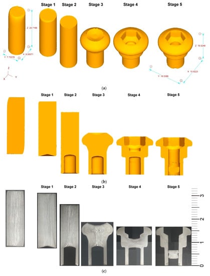 The cold-forming experiments were conducted using a 20-tonne universal testing machine under a constant ram speed of 5 mm/min at room temperature. A billet of ϕ7.7 mm × L24.2 mm was cut by the shear die and moved to the next forming stages. The 3D and cross-section views for the initial billet and forming parts of each stage are shown in Figure 1.