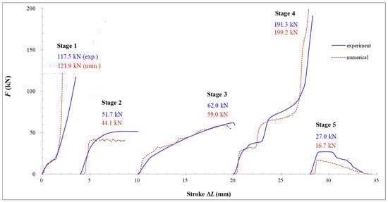 A comparison of the forming forces recorded in the forming experiments with the five-stage forming simulation results is shown in Figure 3. It indicates a good agreement in the forming force responses. The numerical and experimental maximum forming forces are indicated for each stage. The forming stroke and deformation energy for each stage are displayed in Table 3. For the forming forces, as illustrated in Figure 3, the maximum forming forces in the forming experiment and numerical simulation of each stage are very close.