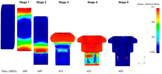 The effective stress distributions are shown in Figure 4 for the final position of each stage, and the maximum effective stresses are indicated. In the first stage, when the billet was contacted with the dies, the stresses are generated at the upper and lower ends, then, the stresses increased as the forming force increased, and the maximum effective stress was 609 MPa. It was observed that the highest effective stress arose at the upper and lower ends of the workpiece, while the lowest effective stress arose in the middle zone of the workpiece. For the second stage, which involved the backward extrusion over the die pin, it was analyzed from Figure 4 that the effective stresses were high in the extrusion deformation region. This resulted in the formation of a cavity at the lower end, which caused high pressure to arise and an effective stress of up to 609 MPa on the workpiece and tool surface.