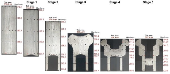 During cold forging, the hardness and strength of the workpiece may increase due to the plastic flow. Figure 6 shows the average hardness (measured in Vickers hardness) of the workpiece cross-section at each stage by experiment. The red dot in the Figure is the position where the maximum hardness was measured. The hardness of the initial billet was almost the same and evenly distributed (about 142 HV), as shown in Figure 6, except for the higher hardness at both ends (about 173 and 194 HV) due to shear deformation. The average hardness overall of the initial billet was 158.6 HV.