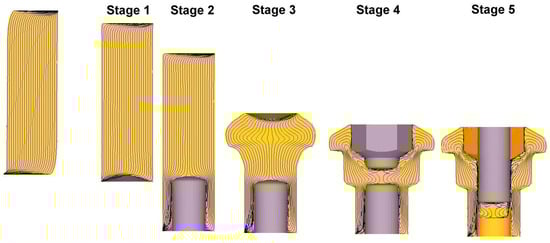 Grain flow is evident when inspecting the interior of the forging. When the metal was deformed by cold forging, the deformed grains and inclusions are distributed in bands along the main elongation direction of the metal to form the grain flow lines. Figure 6 shows, experimentally, the grain flow lines of the workpieces for each stage, and the simulation results of the flow lines for the five stages are shown in Figure 7. A comparison between the simulated results and those revealed by metallographic investigations in Figure 6 indicated a similar flow line arrangement.