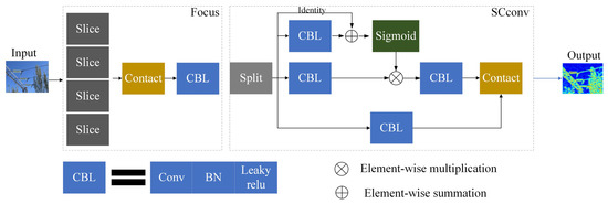For the promotion of the positioning ability of the network for the multi-scaled insulators, the self-calibrated convolutional network with the Focus layer is used in the feature extraction module, which enhances the data. Moreover, it adaptively establishes a potential space around each specific location containing contextual information, which expands the receptive field of the convolutional layer. It enables the network to combine more abundant information and improves the network’s ability to obtain characteristic information when the insulator sample is small-sized. The structure of the improved self-calibrated convolutional feature extraction network is shown in Figure 3.