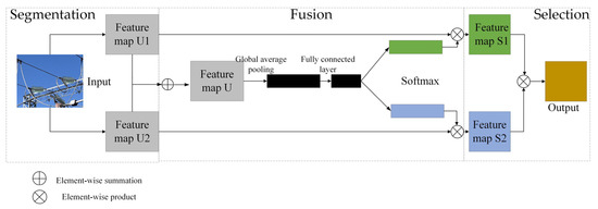 As shown in Figure 5, SKNet can be divided into three portions: Segmentation, Fusion, and Selection. In the segmentation part, the original input image passes two convolution kernels with sizes 3 × 3 and 5 × 5, respectively, to generate two feature graphs, U1 and U2. In the fusion part, firstly, the feature map is fused by element-wise summation, then the feature information is embedded by global average pooling, dimensionality is reduced by the full connection layer, and the binary classification task is completed by the Softmax activation function. Finally, two feature diagrams, S1 and S2, are generated, respectively, in the selection part, and the output feature mask is obtained by element-wise multiplication and weighting.