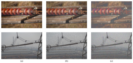Insulator images before and after introducing different noises. (a) Original image; (b) Image with salt-and-pepper noise; (c) Image with Gaussian noise.