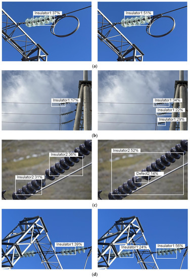 Figure 9 shows the comparison of insulator test diagram samples of large-scale samples, small-scale samples, defect samples, block samples, samples with salt-and-pepper noise, samples with Gaussian noise, and samples with cutout data enhancement under the 30-shot setting. The first column is the test result for the original FSRW model. The second is the test result of the improved model. As can be seen from Figure 9a, the improved method’s positioning ability on large-scale insulator targets is improved by a large margin compared with the original FSRW model. From Figure 9b, the improved model not only improves the positioning ability of small-scale insulator targets but also reduces the occurrence of missed detection. From Figure 9c, the improved method avoids a range of false detections on the whole string of insulators for multiple strings and can better identify the defective part of the insulator. From Figure 9d, compared with the original method, this method can better detect the location and classification information of blocking insulators. Figure 9e,f show that the detection accuracy of this method is still improved after the influence of salt-and-pepper noise and Gaussian noise is introduced, which proves the noise suppression performance of this method. Figure 9g shows that insulator targets can also be detected by this method after cutout rectangular frame occlusion is introduced. This proves that this method can also realize positioning and recognition by using a small part of the insulator’s characteristic information after occlusion. Figure 9 shows the effectiveness of the improved model.