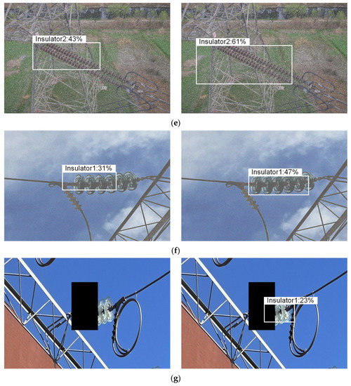 Comparison of insulator detection. (a) Comparison of large scale insulator detection; (b) Comparison of small scale insulator detection; (c) Comparison of insulator detection with the defect; (d) Comparison of insulator detection with blocking; (e) Comparison of insulator detection with salt-and-pepper noise; (f) Comparison of insulator detection with Gaussian noise; (g) Comparison of insulator detection with cutout rectangular frame occlusion.
