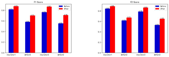 To show the comparison of the detection effects of this method before and after the insertion of the SKNet attention mechanism module, Figure 11 shows the F1-score and F2-score of different categories of this method under the setting of 30-shot. The scores of F1 and F2 in the detection of normal insulators increase by 0.059–0.104 and 0.046–0.075, respectively. Similarly, in the detection of defective insulator parts, the results increase by 0.120–0.156 and 0.056–0.120, respectively. These improvements indicate a broader range of enhancements achieved by the method. The observed improvements can be attributed to the integration of the attention mechanism module into the network. This integration enables the improved network to effectively identify more subtle differences between defects and normal insulators by combining the more detailed features of the insulator image. As a result, the model’s identification ability is further enhanced.