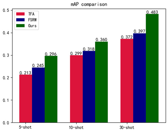 Finally, Figure 12 shows the comparison between the improved method and mAP of TFA [16] and the original FSRW method [17] for few-shot object detection. As can be seen from the results, the mAP of the improved method increased by 5.1% and 8.3% in 5-shot settings and increased by 4.2% and 6.1% in 10-shot settings. In 30-shot settings, the results are improved by 8.6% and 11.1%. This significant improvement indicates that the proposed method has a targeted improvement in few-shot insulator detection tasks compared with the baseline method in dealing with few-shot object detection, which verifies the validity of the improved method.