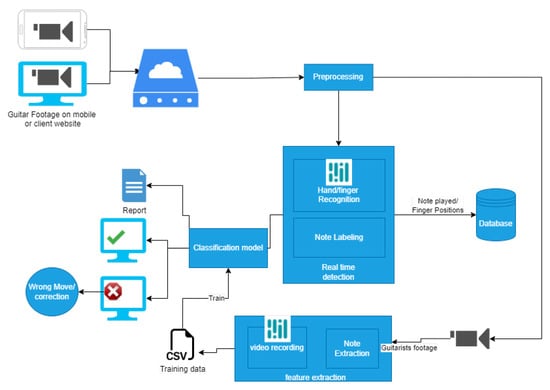 Our novel approach uses the footage of a guitarist, recorded either using a mobile phone or a webcam. The footage is then pre-processed and sent to our note detector and MediaPipe. MediaPipe [27] is a computer vision framework, which is used to extract the finger positions, save them, and send them to our ML classifier. MediaPipe offers a variety of object and landmark detection modules; in our case, we used the hands module. The proposed note classifier detects any note played on the guitar and checks whether it is the right note. Figure 1 provides an overview of the proposed system. The footage of the guitarist is sent to a server, where the music notes and video frames are then extracted.