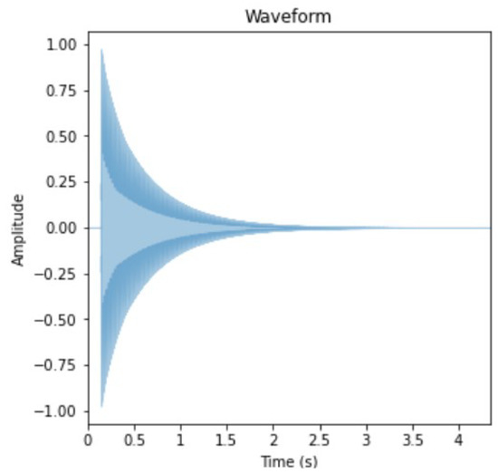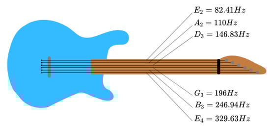A note is essentially a labeled frequency. The system recognizes the frequency of the note played first, then assigns a label based on the detected frequency. Figure 4 demonstrates the frequencies of each note for the guitar when playing open strings. In order to detect the frequency of a note, we need to process the note signal first. We used a discrete Fourier transform (DFT) in our approach to translate the output audio signals generated by the guitarist from the time domain to the frequency domain; in particular, the DFT converts the audio signal from amplitude in time to frequencies and intensities using Equation (1). The frequency–intensity graph of a signal is called the magnitude spectrum. The DFT can transform an audio signal into a magnitude spectrum by translating each signal into a set of cosine functions at different frequencies. The DFT function was used whenever a note was detected from the guitarist, which allowed for the labeling of the note being played, working in parallel with MediaPipe and the ML algorithms used to correct the finger motion mentioned in Section 3.3.