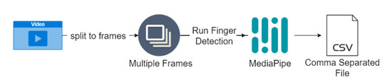 MediaPipe helped us construct a pipeline for our videos. Figure 5 demonstrates the flow of the pipeline. The video is first split into multiple frames. MediaPipe detects the hand finger positions in terms of the x, y, z space for both right and left hands, then returns to the normalized x, y, z positions, according to the screen resolution’s width and height. Finally, the fields stored in the .csv file consist of both the left- and right-hand positions for all 21 landmarks (see Figure 3) across the x, y, z space. Additional fields included in our .csv files were the screen width and height, as well as labels for each finger indicating whether they were placed correctly. We chose to extract the data into .csv format as this made it easy to manipulate, query, and visualize our data.