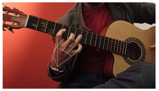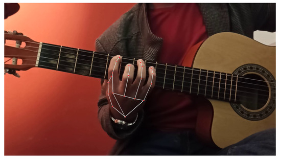 To classify a guitarist’s motion in space, researchers must deal with the guitarist’s hand motion as either signals or as images. Researchers who have treated finger motion as a set of signals—more specifically, electromyographic signals—have obtained a time-series dataset ready for classification [12], and then used a random forest approach to classify the hand motion. The resulting accuracy indicated an improvement over previously described approaches [13]. An SVM approach was also tested for finger motion classification; however, it required more tuning than the random forest. The use of EMG signals can provide high accuracy, but limits the guitarist’s movements. On the other hand, researchers have captured the guitarist’s movement as images and then used a CNN for classification [14], which did not limit the guitarist’s performance. However, the solution built using the CNN was not scalable, as it did not consider many exercises. In this paper, we propose a novel hybrid solution, which uses both finger motion capture (through MediaPipe) to extract finger landmark positions as time-series data, as well as note frequency recognition, in order to assess and improve a guitarist’s overall performance.