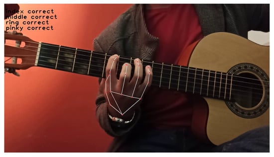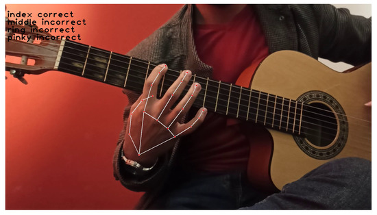 After classifying the hand positions (in Section 4.4), kNN was found to perform poorly due to noise and inconsistency in labeling our movement labeling. Videos where guitarists performed poorly still contained some correct finger positions, which affected the hand position labeling. This problem was solved by labeling each finger position on a range of frames for each recorded video. Then, our classifier was trained using the same algorithms as in Table 5, which summarizes the accuracy scores for each labeled finger. Figure 11 and Figure 12 show an example of the classification by the trained models for a frame with correct finger positions and another frame with incorrect finger positions and an incorrect technique (i.e., finger alignment in the A minor scale with only the index finger aligned correctly), respectively.