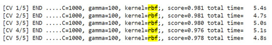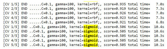 We ran a grid search on the SVM parameters, as its evaluation metrics were relatively low compared to the other tested algorithms. Sigmoid Kernel’s highest score was 0.74 with the C parameter equal to 10. Our highest accuracy reached 0.981 using a c parameter of 1000 and a parameter equal to 1000. In this case, however, we suspected over-fitting as the score on the training set was higher than that on the test set. We settled for the most optimized selection consisting of and , reaching an accuracy of 0.96. While the random forest algorithm still scored higher, the SVM results after tuning were drastically improved. Figure 13 and Figure 14 depict the index finger’s model grid search process when using sigmoid and RBF kernels as well as just RBF kernels, respectively. Moreover, the highlighted values reveal that the scores of the sigmoid kernel are rapidly decreasing, whereas the rbf outperforms the sigmoid scores.