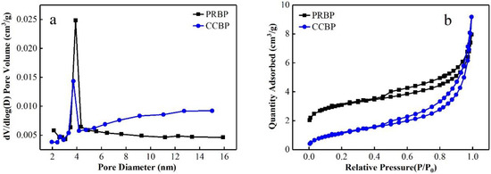 The pore size distribution (a) and N2 adsorption–desorption isotherms (b) of PRBP and CCBP.