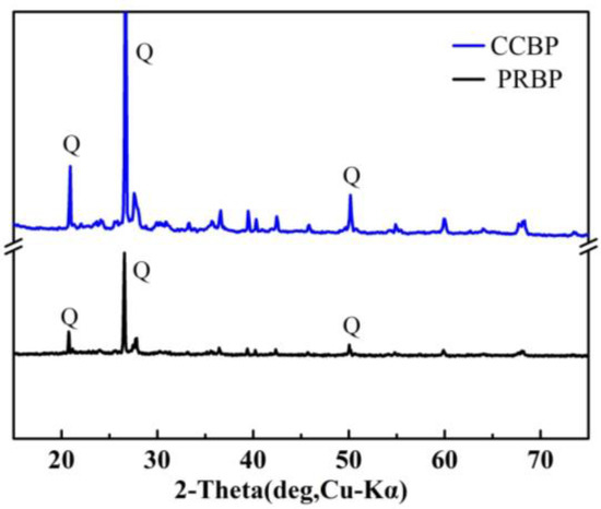 To investigate the characteristics of the waste bricks further, XRD analyses of the PRBPs and CCBPs were conducted, and the results are shown in Figure 3. Significant peaks were observed at 20–26°, which were attributed to the SiO2, consistent with previous studies [34]. After functionalization with CTAB, the main diffraction patterns of the bricks remained virtually unchanged, indicating that the primary structure and composition of the waste red bricks were largely unaltered. The increasing intensity of CCBP suggested that the amount of CTAB incorporated into the samples’ framework was limited and did not lead to significant structural changes.
