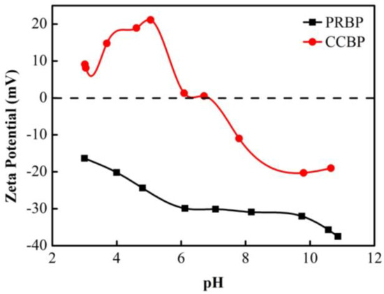 The zeta potentials of the PRBPs and CCBPs are shown in Figure 4. As the pH values of the solution were increased from 2.0 to 12.0, the zeta potentials of the PRBPs remained negative, indicating that the surface charges of the PRBPs were predominantly negative. On the other hand, for CCBP, the zeta potential increased initially with the increase in pH values, followed by a decrease, and the isoelectric point was observed at approximately pH 7.0. This result suggested that CCBPs mainly demonstrated electropositivity with the solution at a pH ≤ 7.0, while they showed electronegativity with the solution at a pH ≥ 7.0. These results could be attributed to the characteristics of CTAB, which showed good coordination with anionic nonionic amphoteric surfactants [31]. The cation exchange between CTAB and the PRBPs could change the surface characteristics and electrical property of the adsorbent, which would be beneficial for the removal of negatively charged contaminants from aqueous solutions.