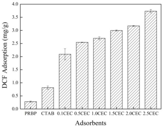 Figure 5 illustrates the adsorption performance of DCF onto PRBPs, CTAB, and CCBPs (modified with different amounts of CTAB). The results indicate that the PRBPs have a low adsorption capacity for DCF removal, whereas CTAB exhibits some adsorption behavior but with a low capacity. However, the capacity of DCF adsorption onto waste bricks is significantly enhanced with the addition of CTAB. As the CEC amount increases from 0 to 2.5, the adsorption capacity of the CCBPs gradually increases from 0.36 to 3.74 mg/g. This improved adsorption capacity is attributed to the strong interaction between CTAB and DCF, which is in line with the adsorption behavior observed for 1-naphthol onto β-cyclodextrin-modified graphene oxide nanosheets [35]. To further investigate the behavior of DCF adsorption onto the CCBPs, the adsorbent modified with 2.5 CEC (CTAB) was selected for subsequent batch experiments.
