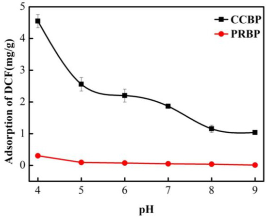 To explore the influence of pH values on the adsorption of DCF onto waste bricks, amounts of 0.06 g of both PRBP and CCBP were added separately into 30 mL solutions containing an initial DCF concentration of 20 mg/L. Using HCl and NaOH solutions, the pH values were adjusted and kept constant at around 4.0–9.0 during the entire adsorption process. The mixture solutions were stirred at a speed of 150 rpm for 24 h at a temperature of 298 K. The experimental conditions were the same as those used in the removal efficiency experiments, and both blank control and parallel samples were included in the experiment.