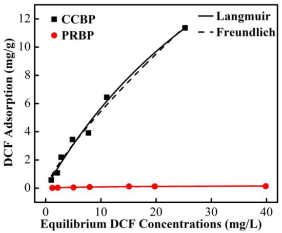 The isotherms of the adsorption of DCF onto the PRBPs and CCBPs are presented in Figure 9. The results show that the adsorption capacity of DCF increases as the equilibrium concentration increases for both adsorbents. However, the CCBPs exhibit a significantly higher adsorption capacity than the PRBPs at all equilibrium concentrations, highlighting the considerable impact of CTAB modification on the removal of DCF from aqueous solutions.