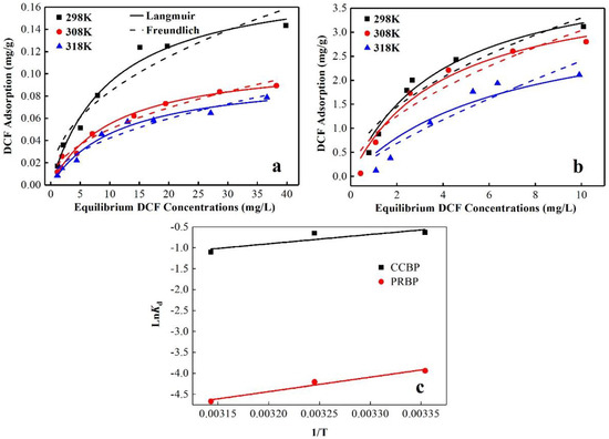 Adsorption thermodynamic of DCF onto (a) PRBPs and (b) CCBPs, (c) Van’t Hoff plot of PRBPs and CCBPs (experimental conditions: dosage = 2 g/L, T = 298 K, pH = 4.0 ± 0.1).