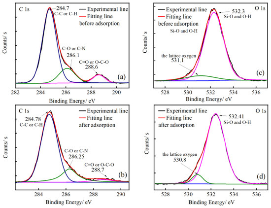 The XPS spectra of (a) C 1s before adsorption, (b) C 1s after adsorption, (c) O 1s before adsorption, and (d) O 1s after adsorption.
