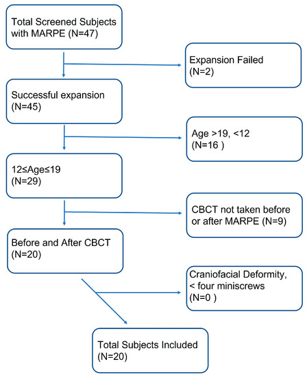 The inclusion criteria were as follows: (1) CBCT was performed before expansion (T1) and after palatal expansion treatment (T2); (2) adolescent patients aged 12–19 years; and (3) four miniscrews without failure during treatment were used with the same MARPE appliance. The exclusion criteria were as follows: (1) craniofacial deformity, such as a cleft palate; (2) palatal expansion that did not occur as planned after MARPE; and (3) history of orthodontic treatment and/or orthognathic surgery.