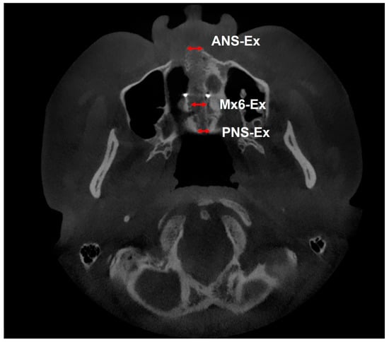 Skeletal (ANS-Ex, amount of expansion of the midpalatal suture at the ANS site; Mx6-Ex, amount of expansion of the midpalatal suture at the maxillary first molar area; PNS-Ex, amount of expansion of the midpalatal suture at the PNS site; UNW, anterior nasal width at the level of the buccal bone vertically; IZW, inter-zygomatic width; NSdev, nasal septum deviation; NW-lower, lower nasal width; NW-upper, upper nasal width; MxBBW, maxillary basal bone width), and dentoalveolar (Mx6W, maxillary intermolar width; Mx6Ax, maxillary first molar axis) measurements were analyzed. The landmarks, reference planes, and measurements used for CBCT in this study are depicted in Table 1 and Figure 3, Figure 4 and Figure 5.