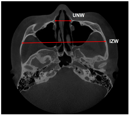 Measurements in a cross-sectional slice of the zygomaticomaxillary suture: UNW, anterior nasal width at the level of the buccal bone vertically; IZW, inter-zygomatic width.