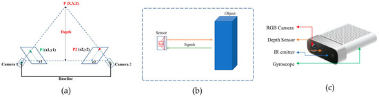 Different types of depth sensors. (a) stereovision system, (b) TOF sensor, (c) Microsoft Kinect/depth camera.