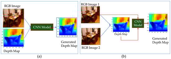 Depth mapping is an ill-posed problem because it can be generated from many respective scenes. Therefore, recently, depth maps have been developed with deep-learning methods. Many researchers have tried to solve depth problems using deep convolutional neural networks [5,6,7]. Deep-learning techniques are adopted to create depth maps because they can solve scale invariance and distorted boundary problems. In deep learning, the depth-estimation task is divided into three domains. The learning can be supervised, semi-supervised, and unsupervised to train the model [8]. In general, supervised learning requires the whole available dataset during training [9]. The unsupervised learning methodology does not require labeled datasets; rather, the datasets are generated during or before the training. Generally, unsupervised depth-mapping datasets are generated with traditional stereovision systems [10,11]. Similarly, semi-supervised learning is a hybrid type of learning where models are trained with partially labeled and partially unlabeled datasets.