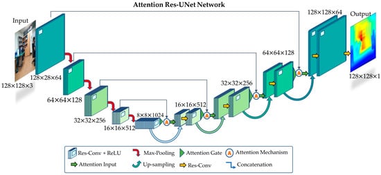 In this study, we build a fully convolutional Res-UNet with attention blocks for depth-map estimation. As a result of the effective use of GPU memory and outstanding speed, UNets are frequently employed for image-segmentation tasks. The latter benefit mostly involves extracting visual features at various image scales. As depth maps are similar to segmentation tasks, because depth values also behave as a multi-class classification task, we agreed on the idea of using Res-UNet with attention models in our model. In our proposed model, we replaced the simple two-dimensional convolutional layers with residual layers and we added attention models with spatial attention gates in the decoder layers. The schematic diagram is shown in Figure 4. We will explain our model in detail in all aspects below.