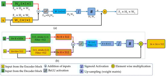 In Figure 6a, at the gating, there are two inputs g and x. The input g is coming from the decoder of the network, carrying better feature representation; x comes from the encoder through skip connections, meaning it has better spatial information. The job of attention is to pass those features which are more relevant to the output, such relevant features have higher weights while irrelevant features have lower weights. Attention is fed by both x and g at the same time. Attention applies a 1 × 1 convolution with a stride of 1 on input g, while on input x it applies a convolution of 1 × 1 with the stride of 2. The convolution with strides of 2 on x resizes its dimensions to the size of g. Thus, they are added with the same dimensions, and the operation can move forward to the next step.