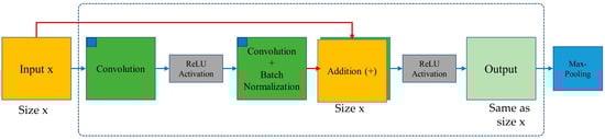 In Equation (2), the function can represent multiple convolutional layers, whereas Ws represents the weights from the previous layer. The form of the residual function is very flexible, as more than two layers are possible within it [28]. The residual layer becomes a simple plain layer when only one layer exists inside the block, but this shows no advantage in feature extraction.