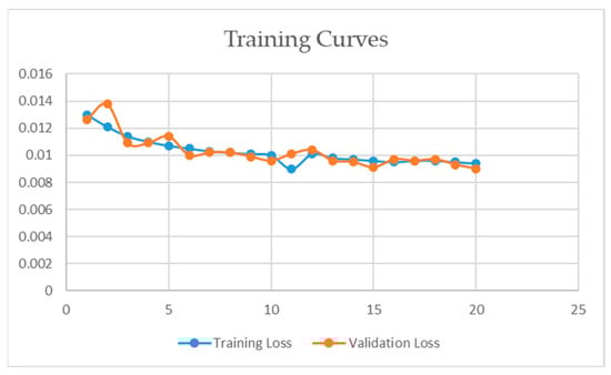 We trained the same model for 20 epochs on the NYU-depth v2 dataset with the input size of 128 × 128, because the dataset size was very large and it required more time to train. We set the batch size to 8 due to GPU memory. Similarly, the same Adam optimizer was used with the learning rate of 0.001. The model took approximately 26 h on the NYU-depth v2 dataset. We also experimented on the same dataset with the input size of 256 × 256 which took around 3 days to train, and the results were almost identical with those of the previous model. The training curve is shown in Figure 11.