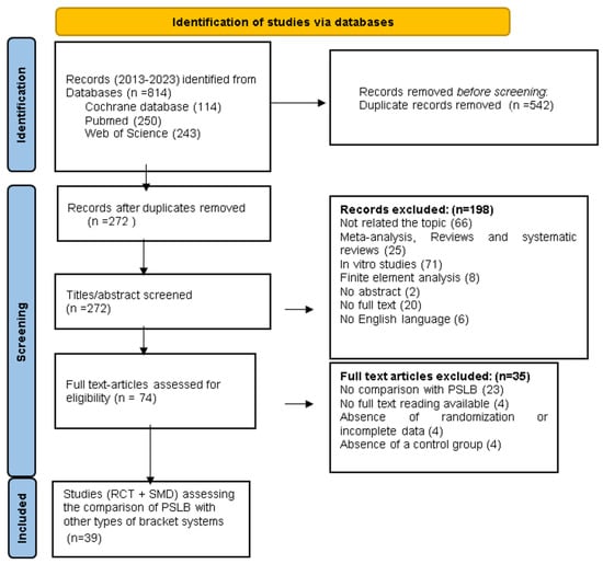 Our search criteria were confined to scientific articles written in English that were published between January 2013 and January 2023, including split-mouth design studies (SMDs) and randomized controlled trials (RCTs).The clinical studies included patients undergoing fixed orthodontic treatment with either ASLBs, PSLBs, or CBs, with at least one comparison between PSLBs and one of the other two bracket types.