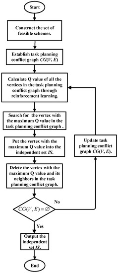 As shown in Figure 4, we first construct a set of feasible schemes. On this basis, we construct a task-planning conflict graph and calculate the Q values of all vertices in the graph. Then, according to the Q evaluation function trained by deep learning, we select the vertex with the largest Q value. Additionally, we add this selected vertex to the current local solution IS. Afterward, we deleted the vertex from the task-planning conflict graph, and the task-planning conflict graph is updated. Lastly, we repeat the above process until there are no remaining vertices in the task-planning conflict graph. The current local solution IS is the optimal independent set.