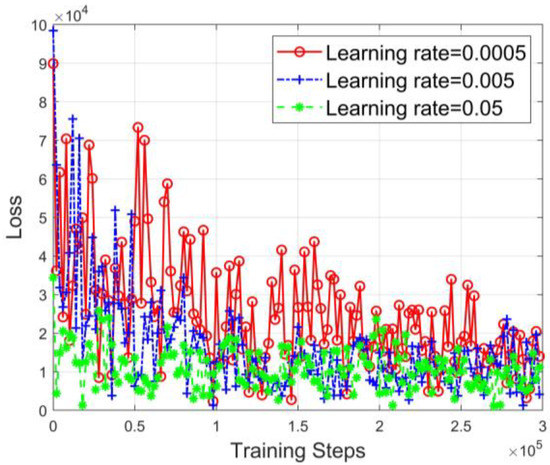Figure 6 shows the convergence of training the function Q network at different learning rates. It can be seen that the larger the learning rate, the faster the Q-function converges. When the learning rate is 0.05, the loss function converges the fastest, but the result quickly falls into the local optimum. When the learning efficiency is 0.0005, the convergence speed of the loss function is too slow, resulting in too long a training time to achieve a good training effect. Therefore, this paper uses a learning rate of 0.005 to train the Q evaluation function. Because this can not only prevent the loss function from converging too slowly but also prevent the loss function from falling into a local optimum to a certain extent. Finally, the best training result is achieved.