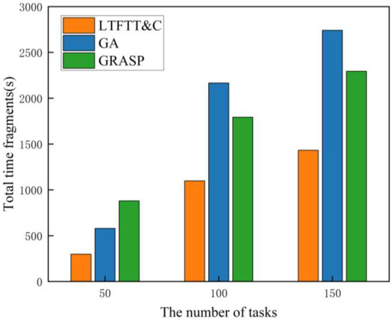 In order to verify the performance of the algorithm proposed in this paper, this paper compares the LTFTT&C algorithm with the randomized adaptive search procedure (GRASP) [22] and genetic algorithm (GA) [23]. It mainly conduct performance comparisons in terms of the total time fragments in different TT&C task scenarios, average response time of emergency tasks, and total task revenue.