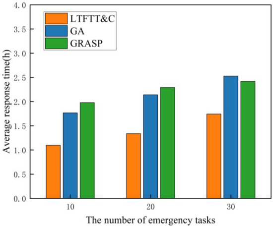 Figure 7 compares the total time fragments of the TT&C equipment of the three TT&C task-planning algorithms under different task numbers. It can be seen that, compared with the other two algorithms, the LTFTT&C algorithm significantly reduced the total amount of time fragments of equipment under different task numbers. Compared with the GRASP algorithm, LTFTT&C reduced the total time fragments of TT&C equipment by 48%. Compared with the genetic algorithm, LTFTT&C reduced the total time fragments of TT&C equipment by 32%. To further verify the LTFTT&C algorithm to reduce the gain of time fragmentation on emergency task planning, the emergency task test response time (i.e., the difference between the emergency task completion time and arrival time) was inserted based on the three algorithms for common TT&C tasks. As shown in Figure 8, with the increase in the number of emergency tasks, the average response time of the emergency tasks of the three algorithms increases to varying degrees, and the LTFTT&C algorithm is obviously better than the other two algorithms. LTFTT&C is 43% faster than the GRASP algorithm and 36% faster than the genetic algorithm in the average response time of the emergency tasks. This is mainly because the LTFTT&C algorithm effectively reduces the amount of time fragments, making it easier for emergency tasks to insert into suitable visible windows.