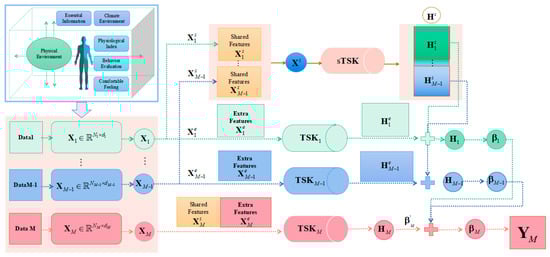 In our study, data are collected from specific people in specific climate regions and in specific scenarios. Subdatasets of M time nodes are obtained under laboratory simulation scenarios and are randomly ordered, and each subdataset contains shared features and extra features. For each time node, the collected datasets can be divided into a shared feature dataset and an extra feature dataset. As shown in Figure 1, the SFG-TFC training structure is divided into the following steps: First, the key shared features that greatly impact decision-making are obtained using the method of information gain, fuzzified, and output by rules. Second, the extra features of each subset are fuzzified and output by rules, and the rule output matrix of key shared features is reprojected to each independent base training unit. Finally, the output weights of the optimized model are integrated to improve the generalization performance of the model. In the modelling process, one of the difficulties and objectives of this study is to strengthen the guiding role of the key shared features in human thermal comfort while considering the enhancing effect of extra features on the final classification performance.