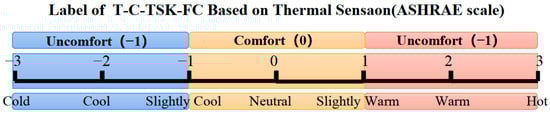In the thermal sensation vote (TSV) scale, which is the most widely accepted scale in recent comfort research, thermal comfort is categorized into seven standards. In the sampling process, this scale is used to obtain the thermal statuses of individuals. In the process of data sorting, the sample labels with individual TSV values of −1, 0, and 1 are defined as comfortable, and the sample labels with individual TSV values less than −1 or greater than 1 are defined as uncomfortable; thereby, constructing binary classification samples, as shown in Figure 5.