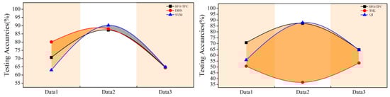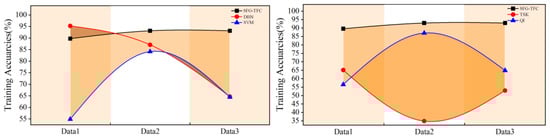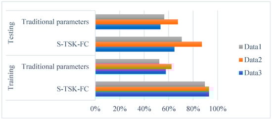 Figure 7 demonstrates that the generalization performance of SFG-TFC is stable. The generalization ability of SFG-TFC is comparable to those of the nonfuzzy algorithms DBN and SVM. Compared with the classic fuzzy algorithms 0-order TSK and QI-TSK, SFG-TFC exhibits better generalization performance. This study demonstrates that this advantage may stem from the integration of all output weights at multiple time nodes in the final training process, which optimizes the final output weights; thereby, improving the generalization performance of the model. Therefore, the method of integrating the output weights of all basic training units improves the stability and generalization performance of the SFG-TFC model.