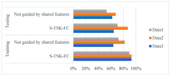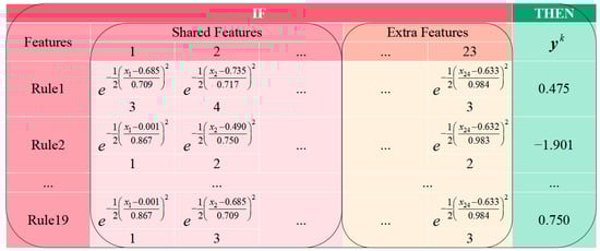Next, a shared TSK fuzzy classifier (sTSK) to be trained on the key shared feature dataset is constructed. According to the basic model introduced in Section 3.1, as shown in Figure 1, the sTSK is trained on the key shared feature dataset to obtain the rule output matrix of the key shared features , , where represents the rule output matrix of the -th subdataset in the sTSK. Therefore, contains the rule output information of the key shared features of each subdataset.