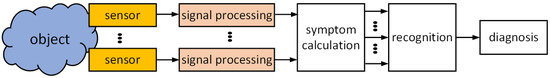 where is the signal realization organized into a vector structure . It is necessary to design and numerically calculate several symptoms to describe the state of individual aggregates. Subsequently, m numerical signs where represents the m-component sign vector , which presents the state of the process or its parts. Equation (1) describes the extraction of symptoms from the vibration signal.