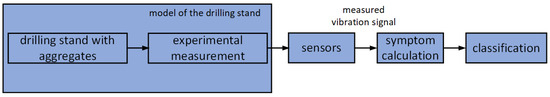 The objective of the experimental measurements was to obtain an accompanying vibration signal during the operation of individual aggregates. By processing the measured signal, it was assumed that information would be obtained about their technical condition. In addition, the research condition of using the signal as a carrier of information was expanding the existing drilling stand with measuring systems. Their task was to digitally measure, display, and archive the process data. For example, a weighted support vector machines (WSVM) method was proposed for automated process monitoring and early fault diagnosis in [26,27].