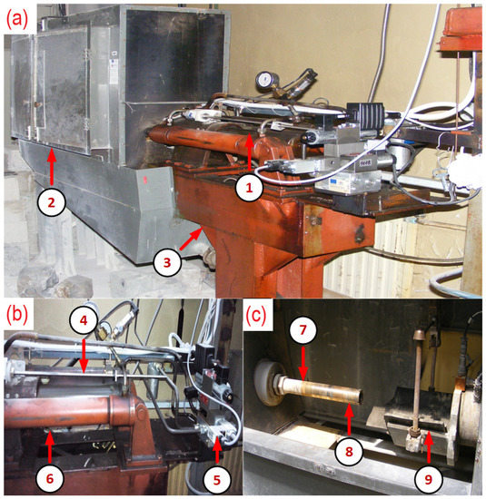 Laboratory horizontal drilling stand: (a) 1—feed mechanism; 2—sheet metal cover of the working tool; 3—stand; (b) 4—slide; 5—control system for the drive spindle; 6—double acting hydraulic cylinder; (c) 7—core barrel; 8—drilling bit; 9—centering sled clamping mechanism.