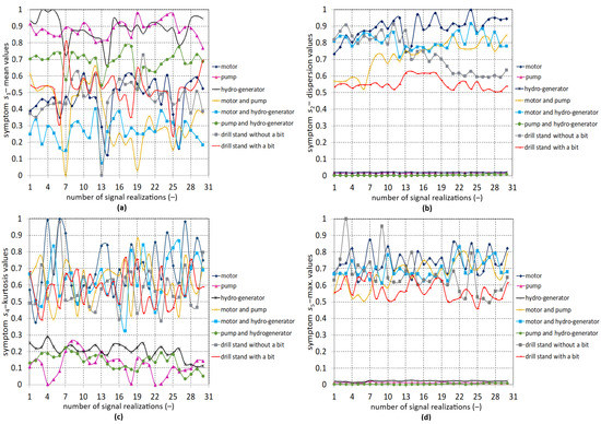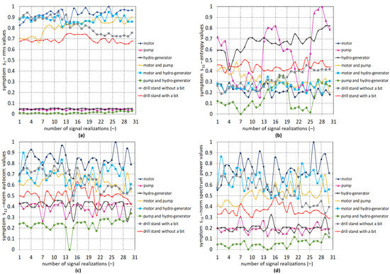 Figure 5 shows the waveform of symptoms , , , and . A more detailed description is required (see Figure 5a) with the waveforms of the symptom —rms. It is clear that the symptom strongly divides the aggregates into two groups again. Similarly to , , and , the first group consists of a pump, hydrogenerator, and their combination. Their symptom values are lower than those of the other aggregates. From this point of view, it can be assumed that the symptom is significant for the recognition and classification of vibration signals. Symptoms , , and are strongly fluctuating in values. The pump has the highest symptom value —entropy. However, the values fluctuate strongly. It is different for the hydrogenerator, which has high but relatively constant values of the symptom (see Figure 5b). At and , the aggregate-separated motor has the highest values, and a pump and hydrogenerator have the lowest (see Figure 5c,d). Symptoms , , and belong to the specific characteristics of the vibration signal, and symptom is calculated from the frequency characteristic.