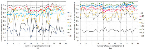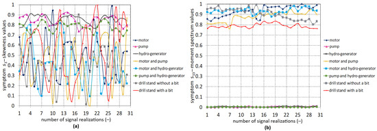 Among the less suitable symptoms based on their waveforms, it is possible to choose , i.e., skewness and , i.e., the moment of the signal spectrum (see Figure 6). The values of the symptom , i.e., the skewness, oscillate vigorously. Assessing the maximum and minimum values is complicated, and the differences between individual aggregates are negligible (see Figure 6a). At the symptom , i.e., the moment of the signal spectrum, two groups of objects are visible (see Figure 6b). The first group consists of a pump, a hydrogenerator, and their joint operation. However, the waveforms overlap so strongly that it is impossible to assess their difference. The second group of objects consists of other aggregates. It is possible to distinguish them partially but not significantly.