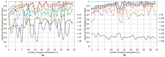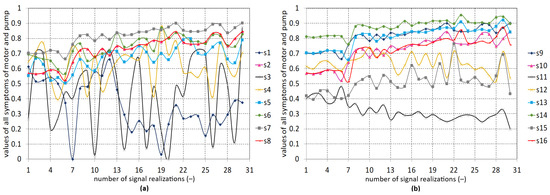 Waveforms of values of selected symptoms of all aggregates , : (a) symptom —skewness values; (b) symptom —moment spectrum values.